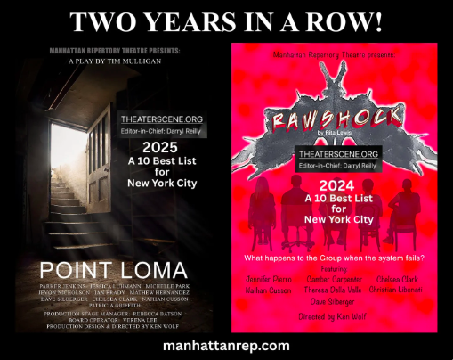 And then this past December after our production of RAWSHOCK by Rita Lewis in the fall, our production of Rawshock was put on Theatrescene.org’s “A 2024 10 Best List!” and sharing the list were BROADWAY SHOWS “Mother Play – A Play in Five Evictions, An Enemy of the People and the Off-Broadway Tuesdays with Morrie!”